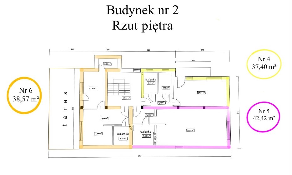 POZIOM 1: Mieszkanie nr 4 o pow. 37,40 mkw, mieszkanie nr 5 o pow. 42,42 mkw, mieszkanie nr 6 o pow. 38,57 mkw.
